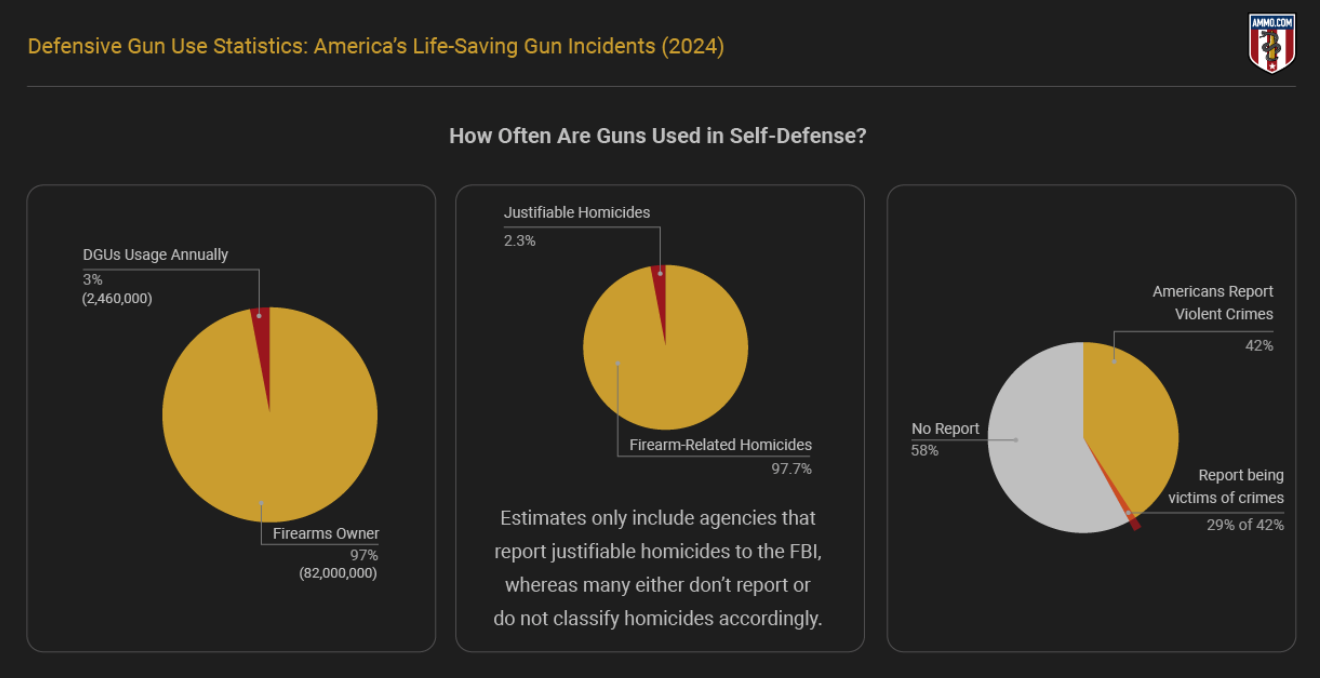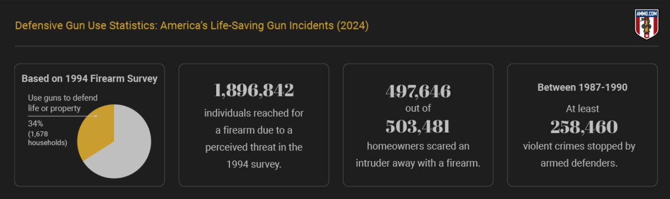 - There are an average of 1,820,000 defensive gun uses per year compared to 1,100,000 reported crimes.