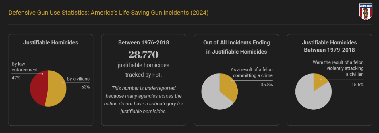 On the low end, guns are used in self-defense in 2.3% of all homicides. However, this includes only data compiled by the FBI, with several agencies failing to report justifiable homicide data. Furthermore, civilians use firearms to save lives more often than police officers. 11)