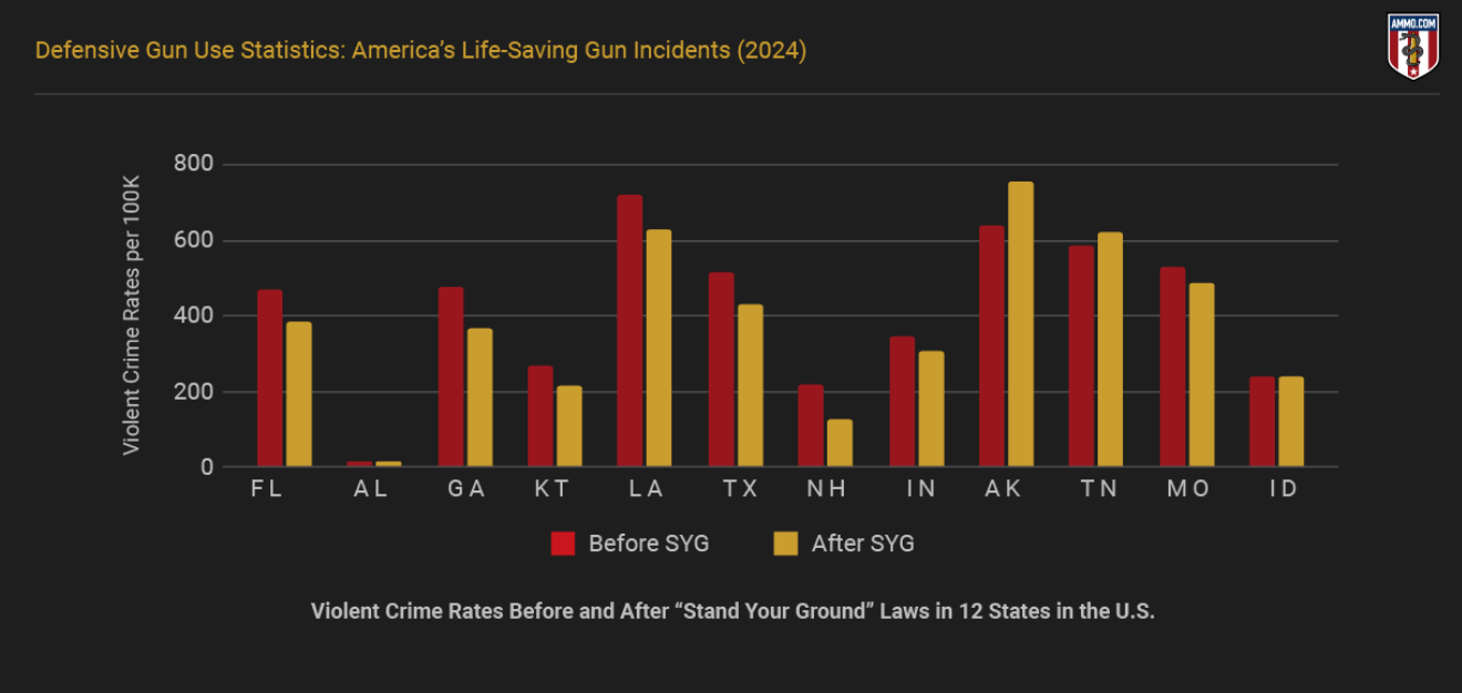 A 2021 study shows that states embracing civilians’ rights to self-defense had little to no impact on violent crime rates. 4 However, 75% of states that passed SYG (Stand Your Ground) laws with no duty to retreat experienced a decline in violent crime victimizations in the following years. 2