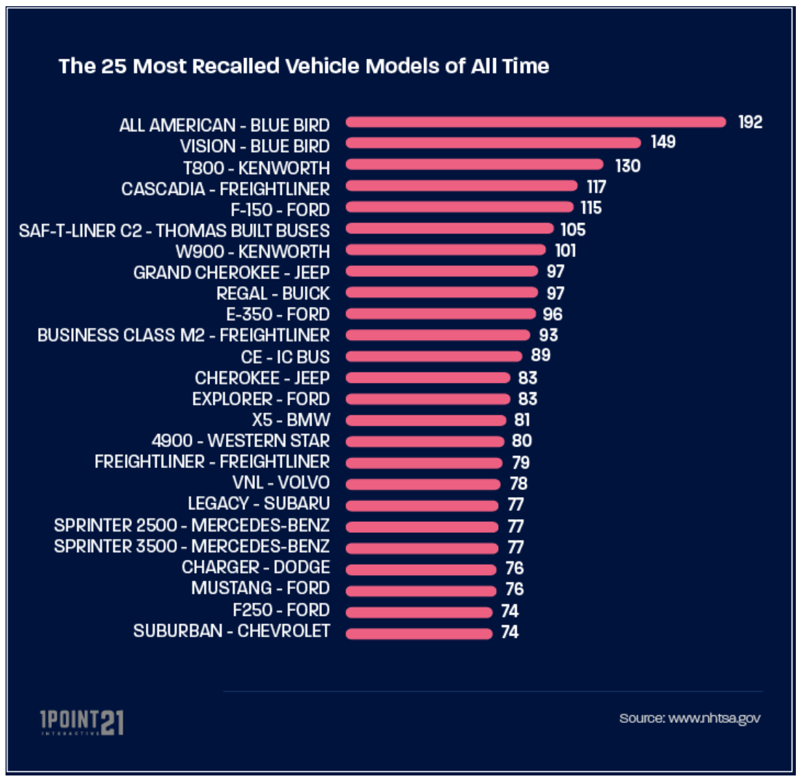 Below is a table of the Top 25 Recalled Vehicle Models of All Time: