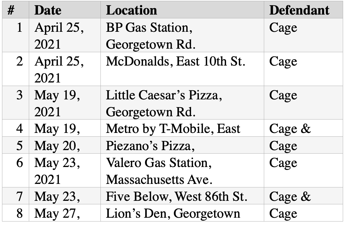 On May 23, 2021, Cage attempted to rob a Valero gas station of fried chicken and a pack of cigarettes using the same gun. When the employee saw the gun, he reached for the fried chicken. Cage shot the employee in the stomach, critically wounding him. Cage fled from the gas station. The same day, he committed another robbery.