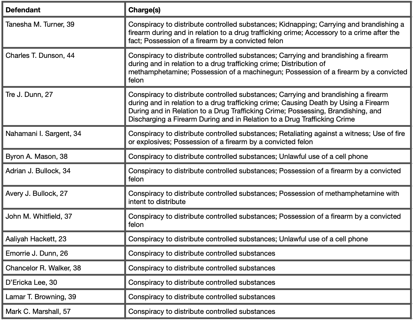 INDIANAPOLIS — 14 individuals have been charged in a federal indictment alleging a conspiracy to distribute methamphetamine, heroin, fentanyl, and cocaine in Indianapolis, Lafayette, and surrounding communities. The charges follow a successful law enforcement operation in which 13 total individuals have been arrested and are in federal custody. Eight individuals were arrested on March 21, 2025. The following lists the individuals indicted and the charges they face: