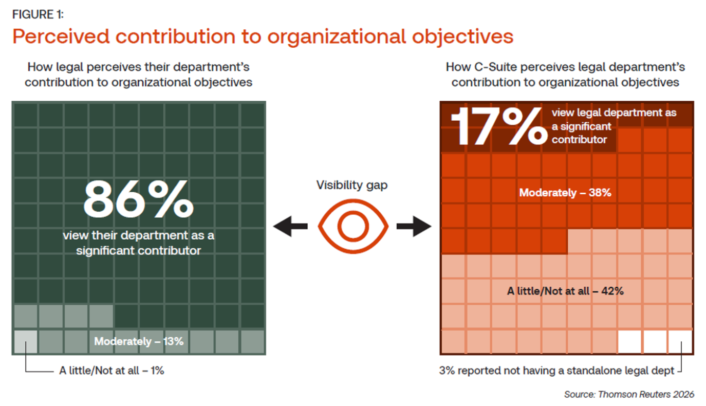The 2026 State of the Corporate Law Department Report, released by the Thomson Reuters Institute, reveals a disconnect between how GCs and their corporate law departments view their own alignment to the wider business, and what C-Suite executives believe the legal department contributes. Within this gap, the message is clear: GCs not only need to align with their organizations’ overall business strategy, they need to learn how to prove that alignment to the rest of the company.