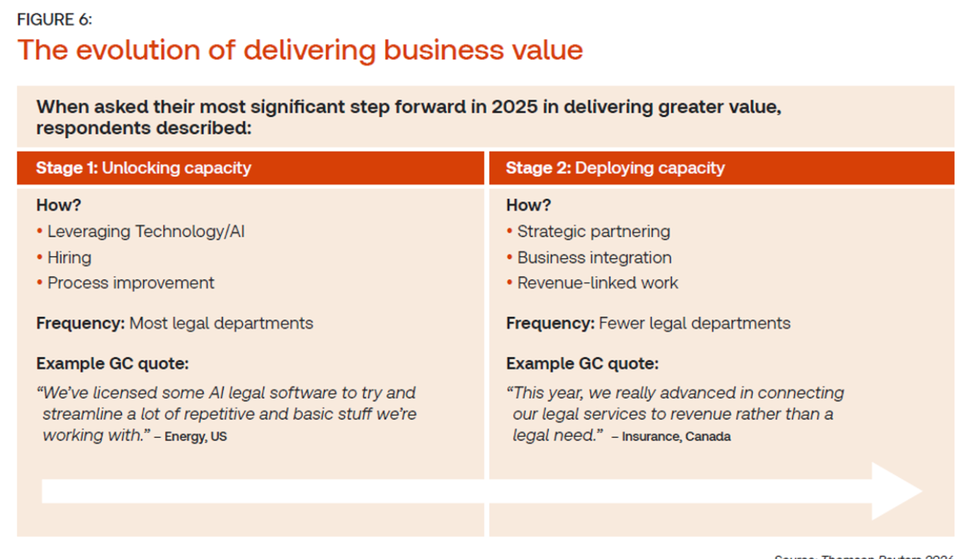 AI and technology should also be approached in this same way, the report argues. Although almost half of all corporate legal departments have some type of enterprise-wide GenAI tool, according to the survey, very few are collecting success metrics around AI’s implementation or linking its use to business revenue. Put a different way, many legal departments are focused on unlocking capacity, rather than deploying capacity in a business-centric way — much to the chagrin of their C-Suites.