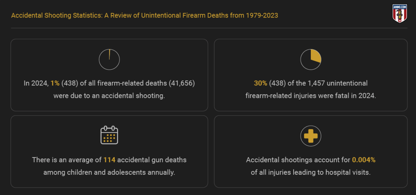 - In 2024, 1% (438) of all firearm-related deaths (41,656) were due to an accidental shooting.