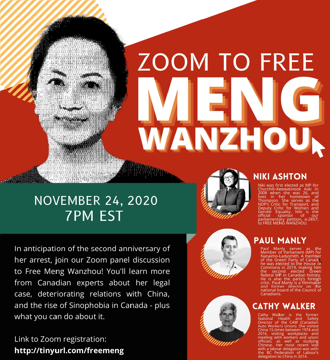 I attended the virtual event “Zoom to Free Meng Wanzhou” which was organized by the Canadian Foreign Policy Institute, the Canadian Peace Congress and the Hamilton Coalition to Stop War. The purpose of these organizations is to prevent wars and disputes. Further, they fight for humans’ rights. During the event, there were calls for the release of Meng Wanzhou