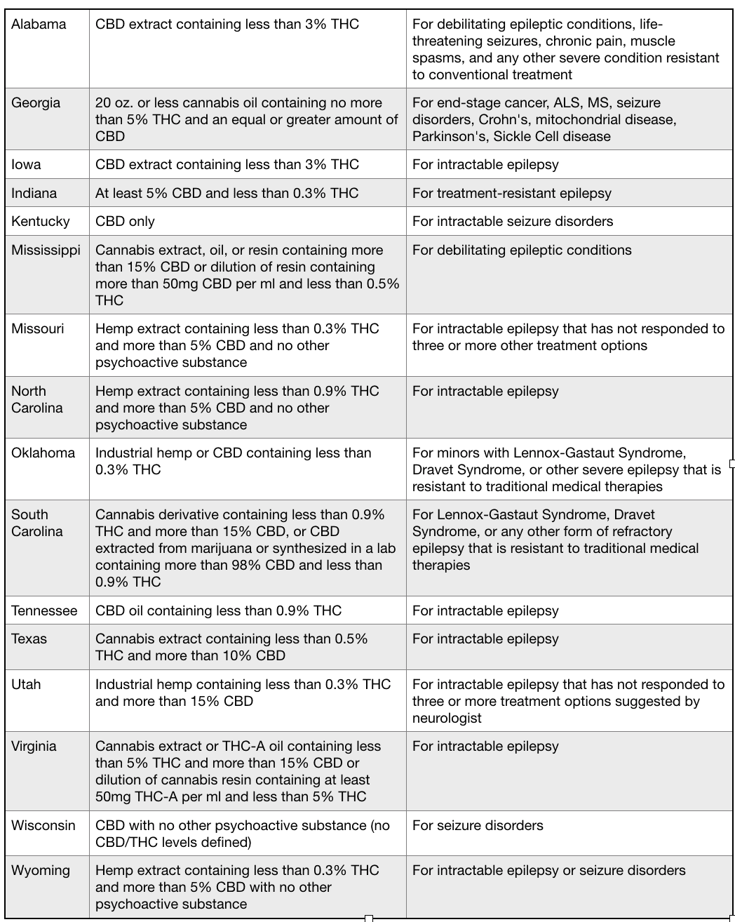 Sixteen states implement a limited medical marijuana program which specifies what type of cannabis preparation is allowed and for what types of medical condition. Many of these laws focus on “low THC, high CBD” products for treatment-resistant seizures.