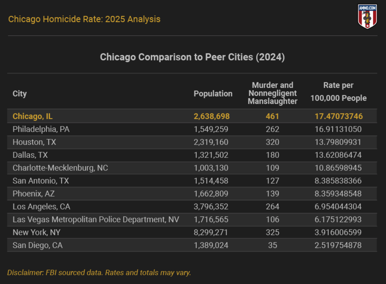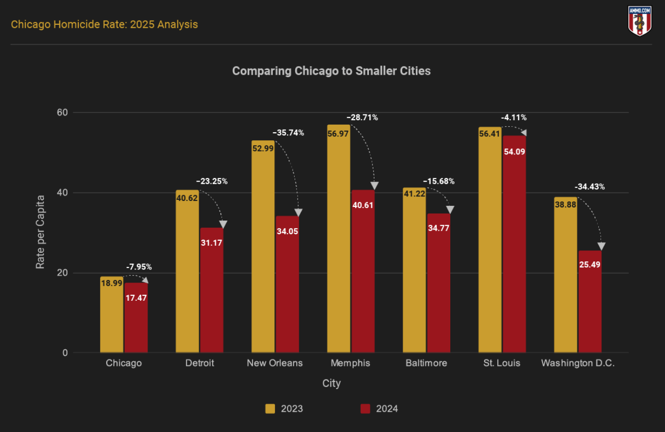 The aforementioned five cities had an average murder rate of 46.14 per 100,000 in 2024, and an average of 258.2 total homicides. Had Chicago reported the same number of homicides, its murder rate would become only 9.82 per 100,000 in the same year. This illustrates the statistical impact of its large population.