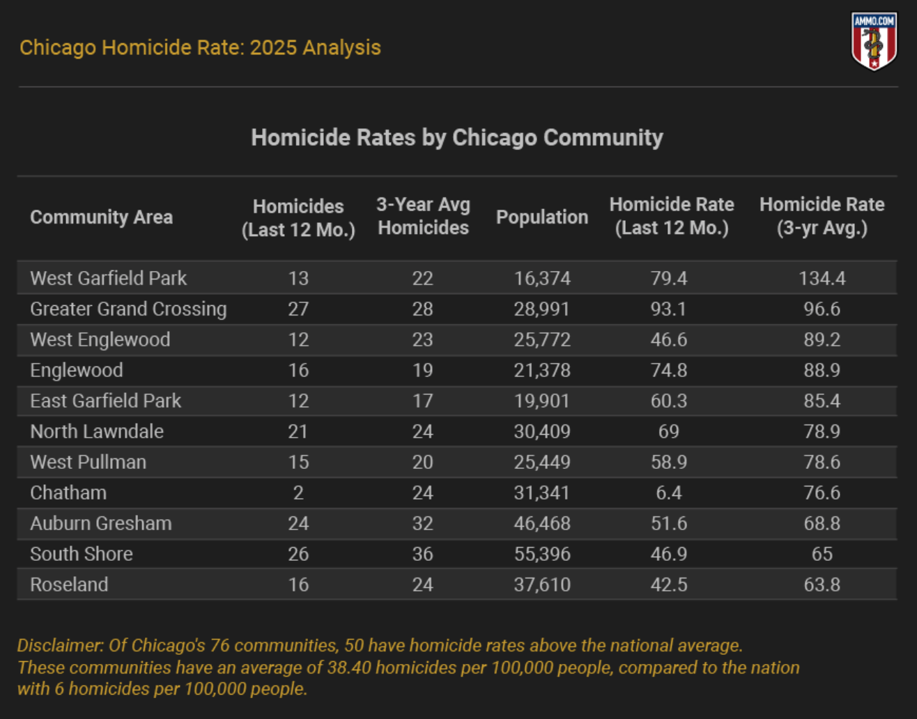 West Garfield Park had the average homicide rate over the past three years at 134 murders per 100,000 people. Greater Grand Crossing had the highest homicide rate over the past year (October 2024-2025) at 93 murders per 100,000. Source 2