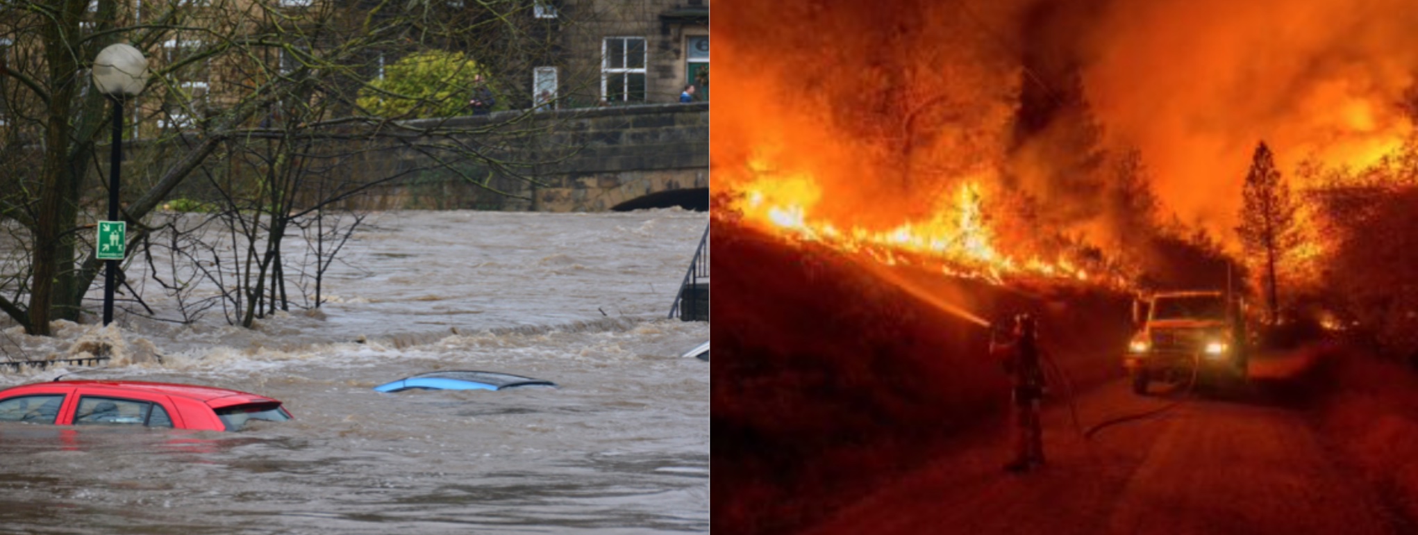 Fire: Public domain photo by Magaret Lammers, courtesy of Pixy.org. CC0. Flood: Three cars submerged in flood waters; image by Chris Gallagher, via Unsplash.com.