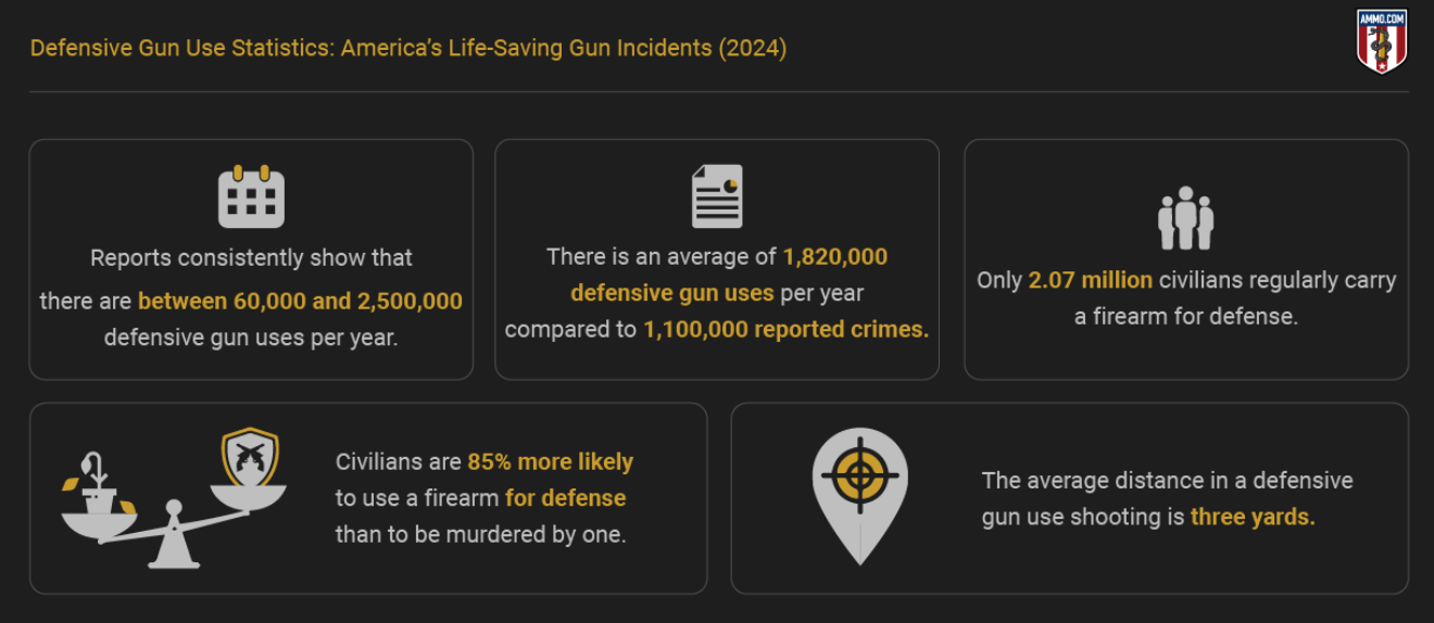 - There are an average of 1,820,000 defensive gun uses per year compared to 1,100,000 reported crimes.