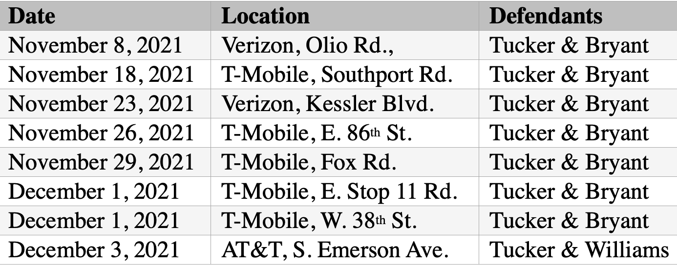 According to court documents and evidence introduced at trial, from November 8, 2021, through December 3, 2021, Tucker and Bryant worked together to rob eight cell phone retailers around Indianapolis. During each robbery, the men brandished firearms and pointed them at employees, demanding cash, cell phones, and accessories from the store and customers. Williams joined in the eighth and final armed robbery as the getaway driver, stole a license plate for the vehicle, and took Tucker to pick up an AR-style rifle used in the robbery.