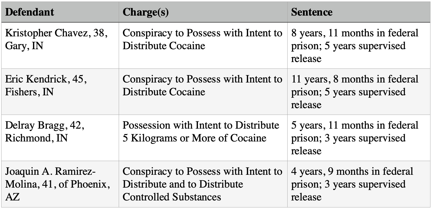 INDIANAPOLIS – Four individuals have been sentenced in federal court for their roles in a drug trafficking organization responsible for distributing at least 55 kilograms of cocaine throughout Central Indiana.