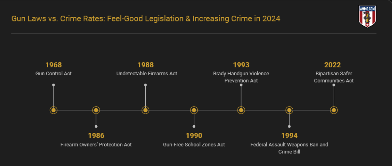 The 1968 Gun Control Act aimed to restrict firearm transfers to felons and those with mental illnesses. Despite its intentions, crime rates quadrupled over the next three decades.