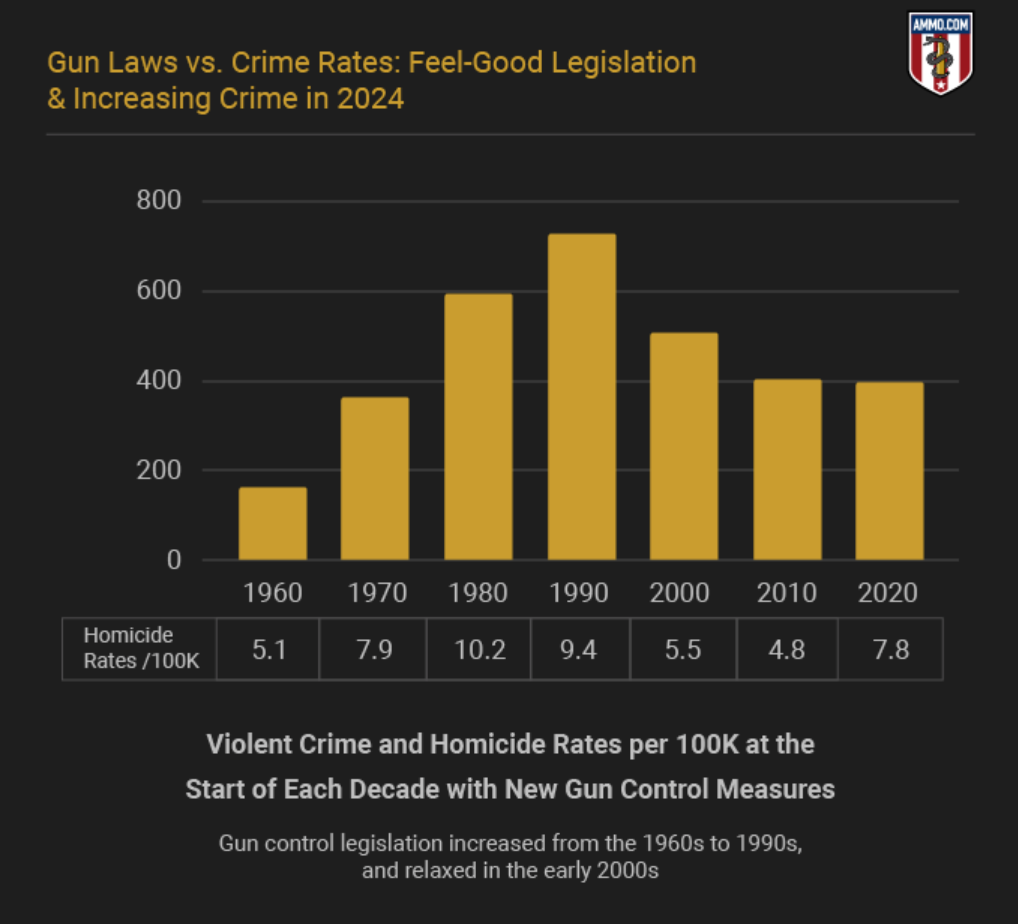 Almost daily, legislators propose new gun laws aimed at reducing crime rates. However, both new and existing laws are unlikely to impact crime significantly. With over 90 years of gun control legislation and crime data, it’s clear that these laws do little to curb criminality or save lives.