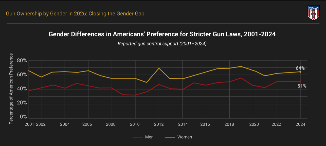 Per the latest surveys in 2023 and 2024, 51% of males and 64% of females support stricter gun laws.