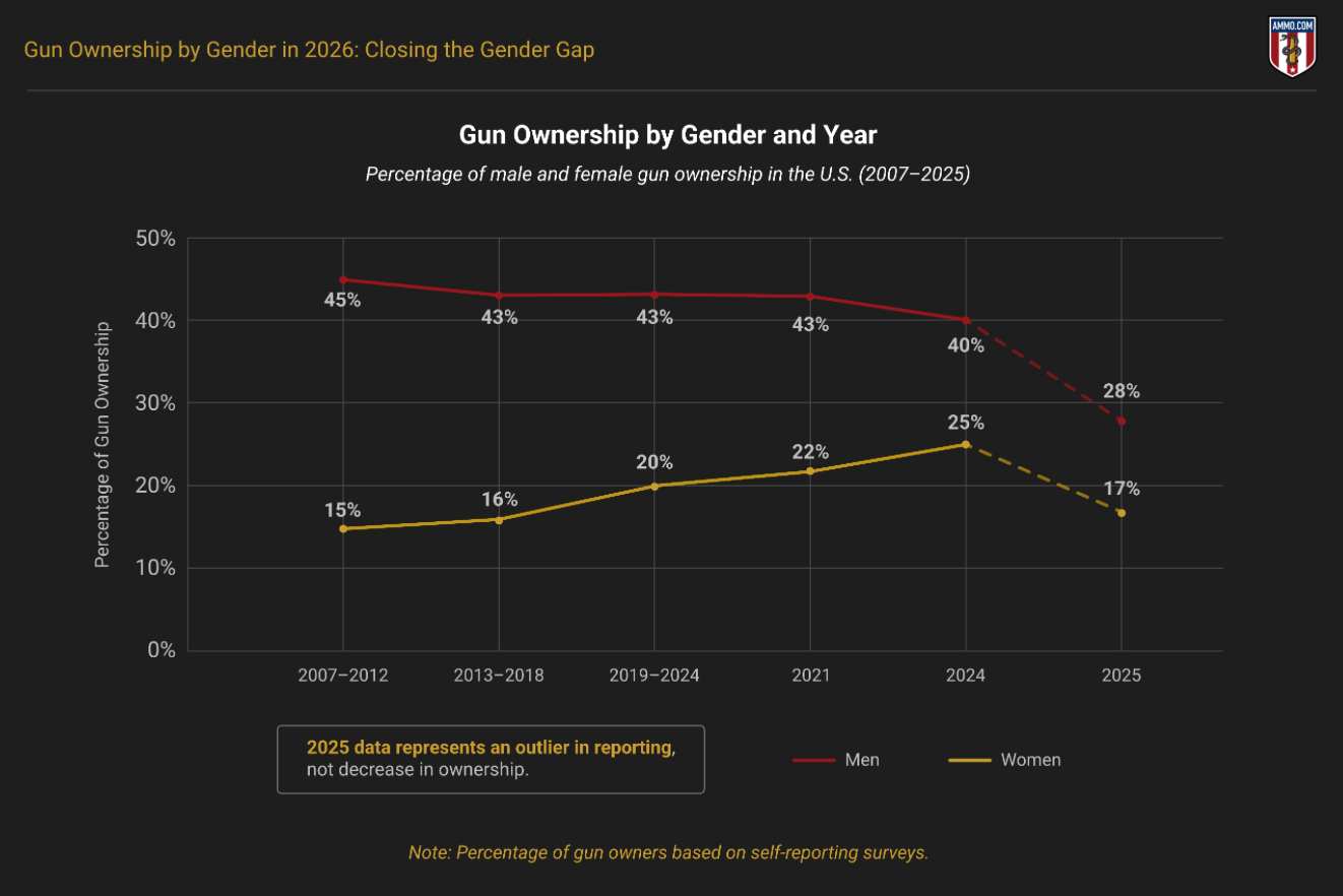 - Between 17 and 25% of U.S. women (29-43 million) reported owning firearms in 2025.