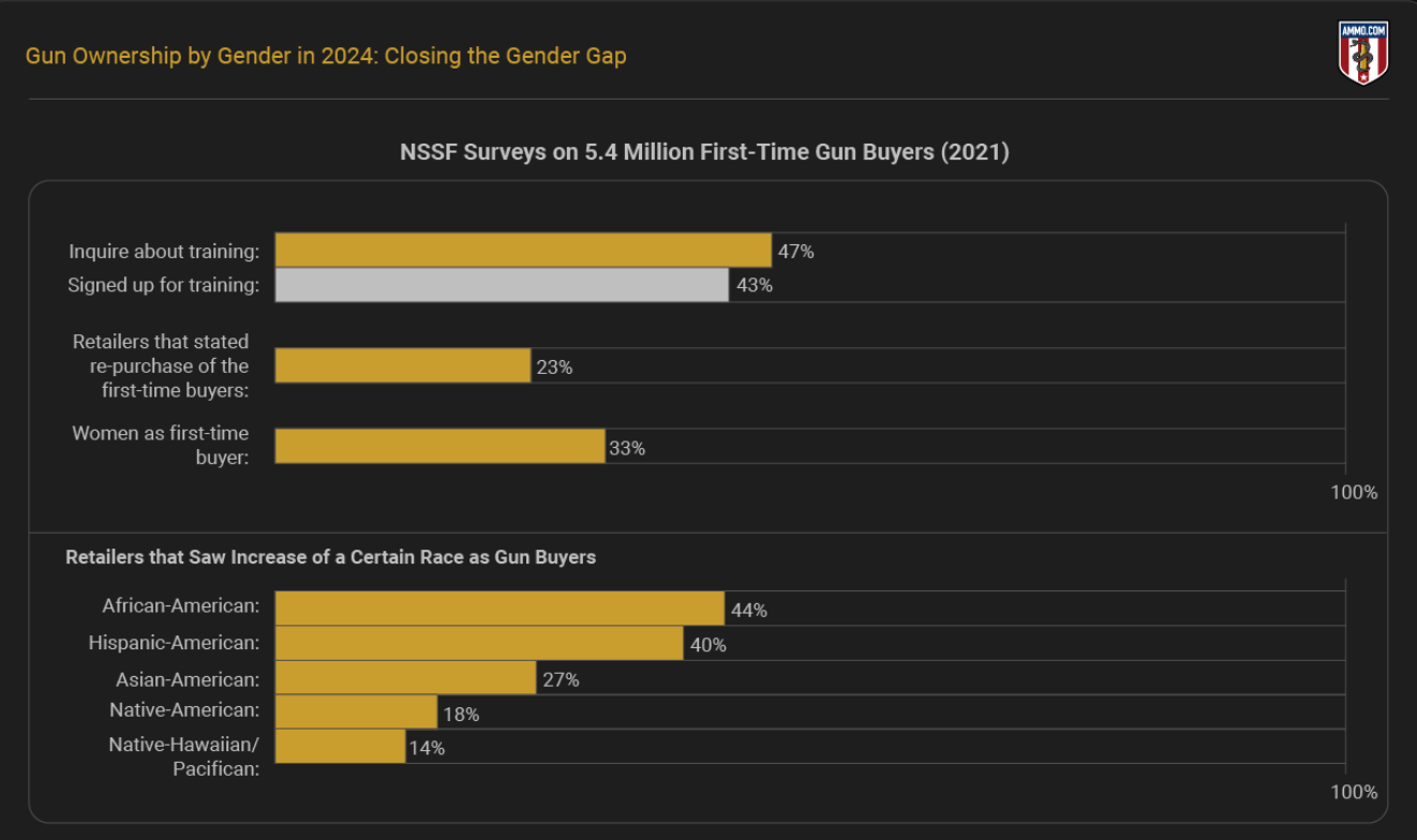 Another survey revealed that nearly half of all first-time gun buyers between 2019 and 2021 were women. In 2019, 50% of first-time buyers were women. Women were 47% of first-time buyers in both following two years.