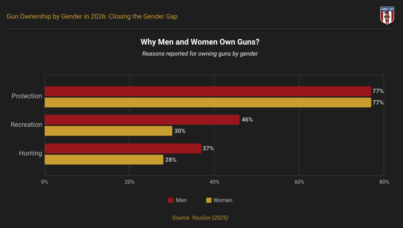 - In 2025, 77% of male and female gun owners cited personal protection as a reason for owning guns.