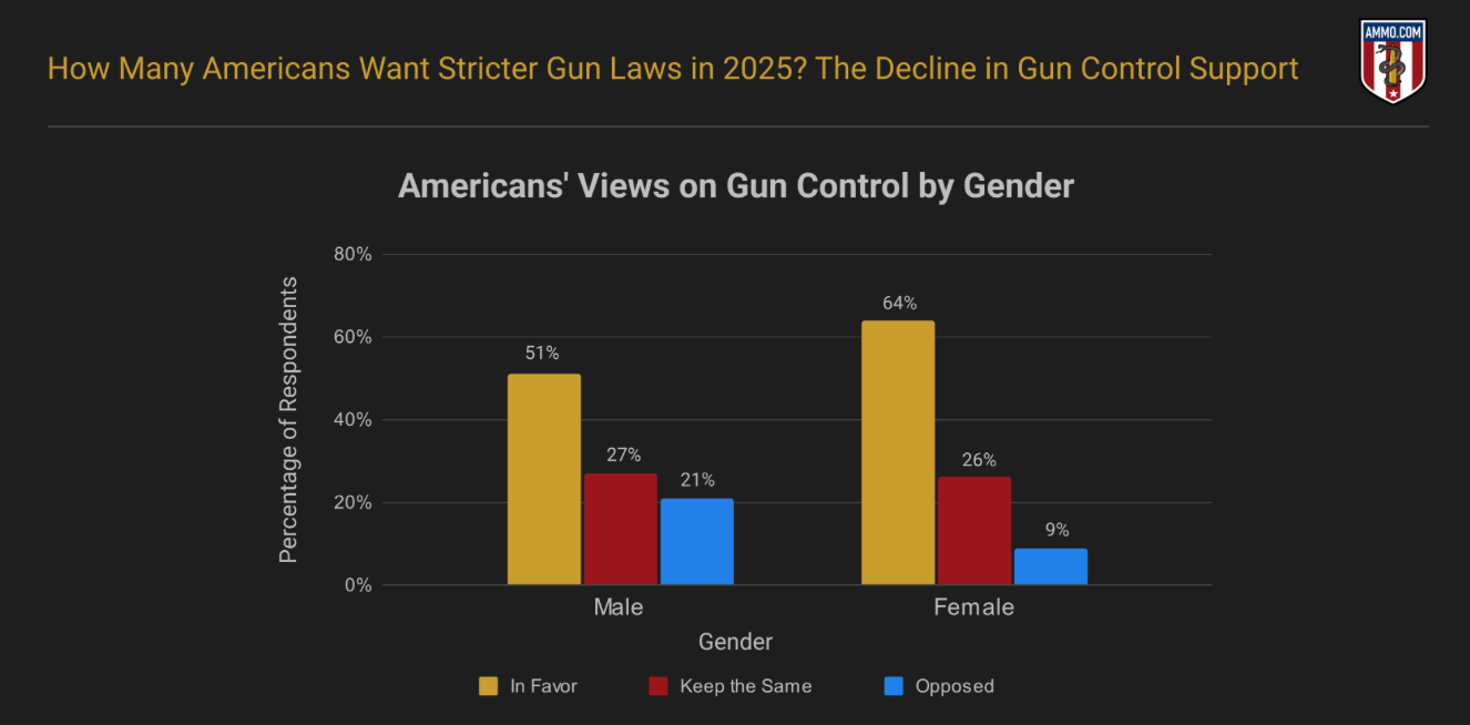 Women are significantly more likely to support stricter gun laws than men, with 64% of women in favor compared to only 51% of men.