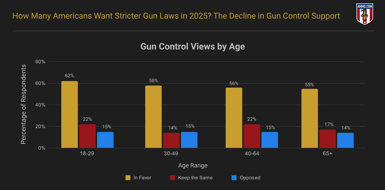 Support for strict gun control tends to decrease with age. Young adults aged 18 to 29 show the highest level of support at 62%. This figure drops to 55% among those aged 65 and older.