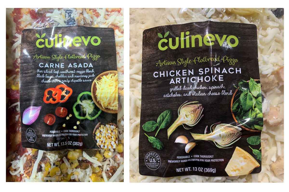 - 13.5-oz. plastic-wrapped cardboard trays containing “culinevo Artisan Style Flatbread Pizza CARNE ASADA”