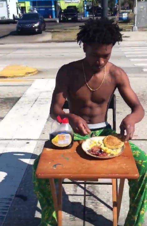 Thomas was evidently positioned in the middle of a very busy intersection. Seen on video and in photos shirtless and wearing green pajama pants, he was eating his breakfast in the eastbound lanes of Memorial Boulevard and Brunnell Parkway as traffic tried to move past.