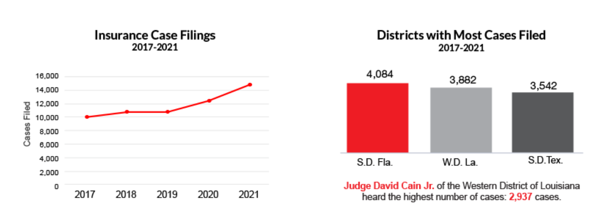 - In 2021, insurance case filings reached a record 14,793 cases, which was a 47% increase in case filings over the last five years (2017-2021).