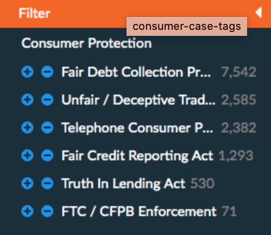 Consumer protection cases allege violations of at least one of the following federal consumer protection statutes: the Fair Debt Collection Practices Act (FDCPA), Fair Credit Reporting Act (FCRA), Truth in Lending Act (TILA), Telephone Consumer Protection Act (TCPA), or a federal consumer protection enforcement statute, such as the Federal Trade Commission Act or Consumer Financial Protection Act. Consumer finance abuse includes litigation over debt collection, credit reporting, truth in lending practices, and other related state and federal statutes. Unfair or deceptive trade practices cover federal and state statutes involving fraud, deception, abuse of consumer information, government enforcement actions, and consumer privacy.