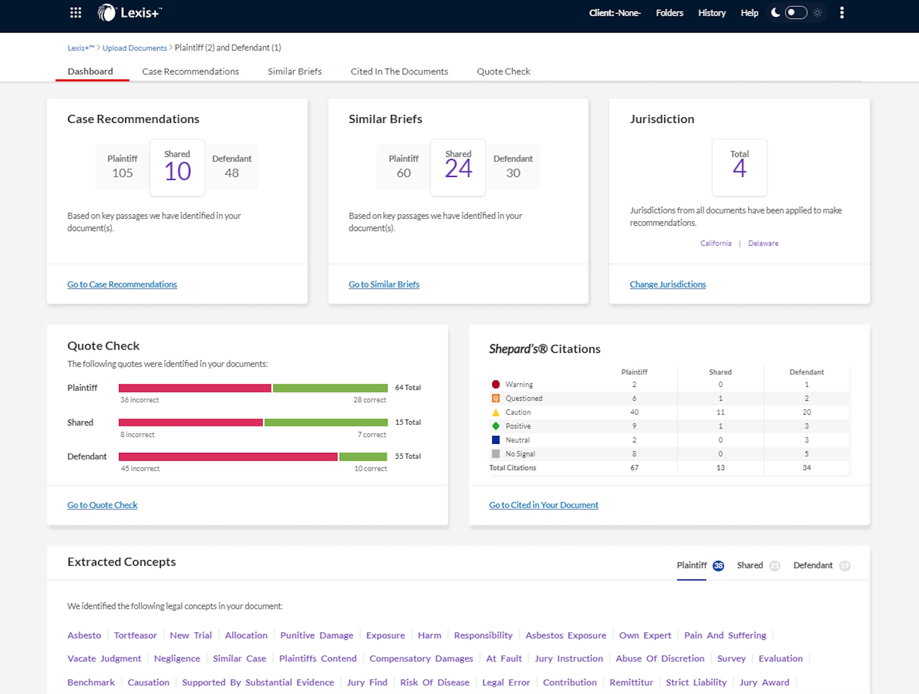 Mirroring the process that judges and court clerks use when analyzing opposing briefs, Lexis+ Judicial Brief Analysis allows lawyers to compare up to six documents (three for each side) and receive one comprehensive report of all caselaw arguments, citations and quotes to determine accuracy, relevance and argument strength. Its bold, intuitive design includes a unique dashboard visualization of extracted concepts, Shepard’s® Citations analysis, quote accuracy and other information that saves a user hours of review time. A new “shared” feature compares how opposing sides used similar arguments or citations in their documents, whether the arguments are “good law,” and whether any modifications were made to the original quotations. The AI-powered tool also recommends relevant caselaw and other content to help attorneys draft the strongest briefs possible.