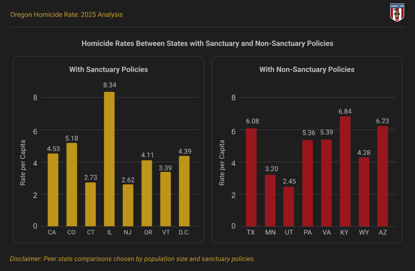Compared to other sanctuary states, including California (4.5 per 100,000) and Illinois (8.3 per 100,000), Oregon continues to report lower homicide rates. Oregon also has lower rates compared to non-sanctuary states such as Kentucky (6.8 per 100,000) and Arizona (6.2 per 100,000), yet higher rates than Utah (2.5 per 100,000).