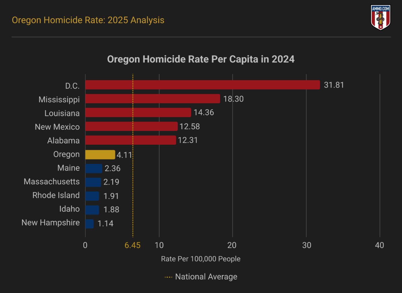 - In 2024, Oregon’s homicide rate was 32% lower than the national average.