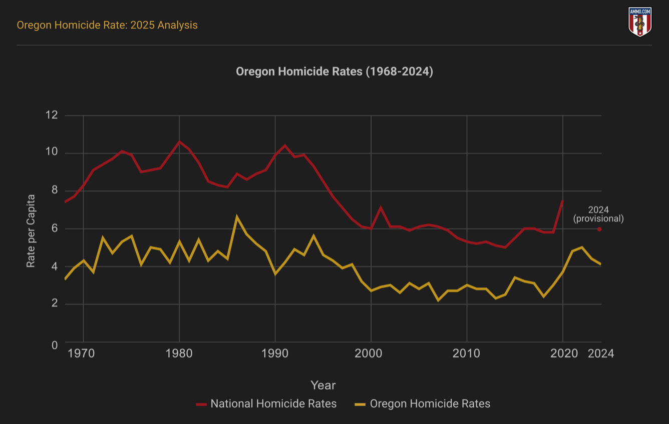 Oregon’s homicide rate increased in the 1970s and 1980s, with the highest homicide rate occurring in 1986 (6.6 per 100,000 people). In 2024, Oregon ranked 37th for homicides in the U.S. at 4.1 per 100,000, with 174 total murders reported to the CDC. (Source 2, 3, 4)