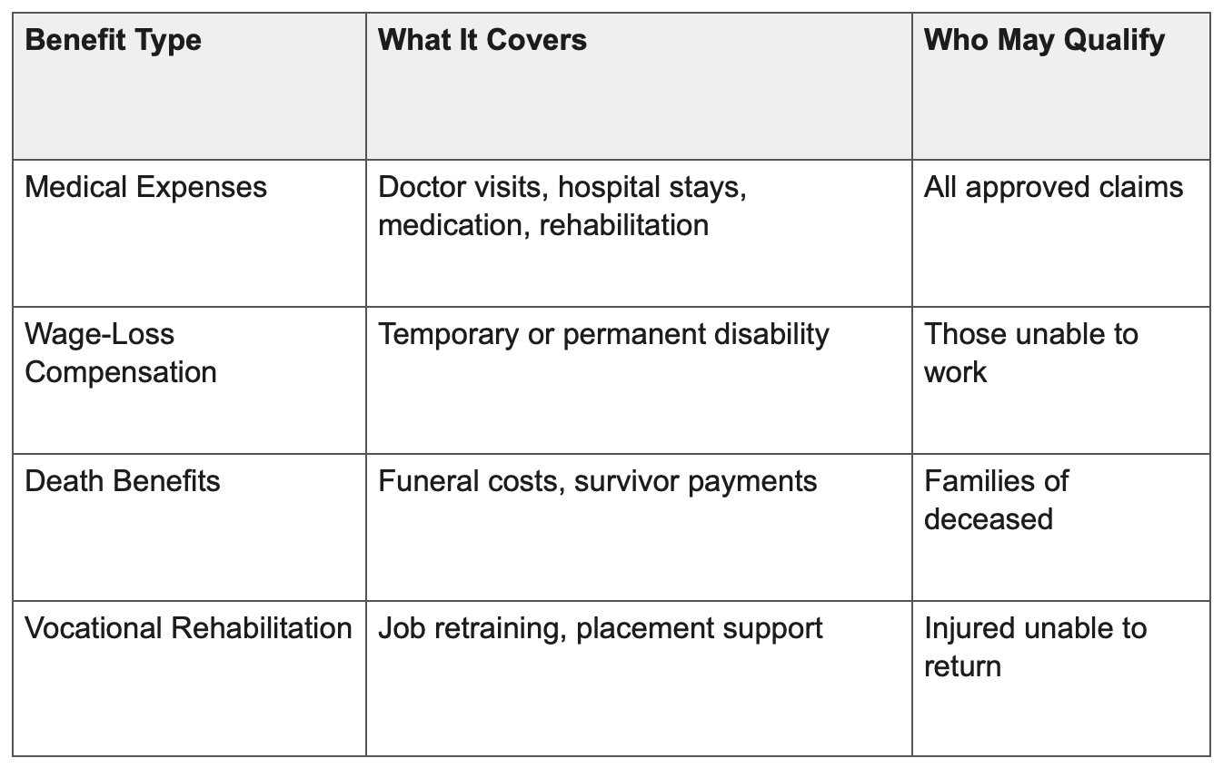 Medical Benefits cover all reasonable and necessary treatment for work-related injuries, including surgeries, medications, and physical therapy. If your injury causes you to miss work, you may receive Wage-Loss Compensation as temporary or permanent disability payments based on your average weekly earnings. If a work-related injury leads to death, certain family members may be entitled to Death Benefits and funeral expenses. If you cannot return to your previous position, you may qualify for Vocational Rehabilitation Benefits for retraining or placement assistance to help you re-enter the workforce.