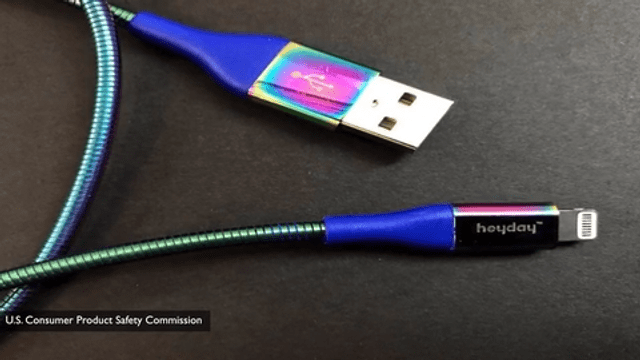 The recalled charging cables are used to charge cell phones and other “electronics that use the Lightning connector.” They were available in green, purple, and blue and “have the word ‘heyday’ printed on the cable’s connector.” Additionally, the recalled charges have the following model number printed on the side of the packaging: 080 08 8261.