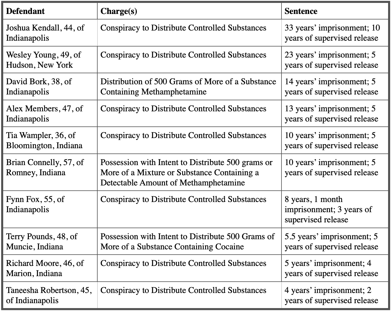 INDIANAPOLIS – Ten defendants have been sentenced in federal court for their roles in a multi‑county fentanyl, cocaine, and methamphetamine trafficking operation spanning Indianapolis, Muncie, Terre Haute, and other areas within the Southern District of Indiana.