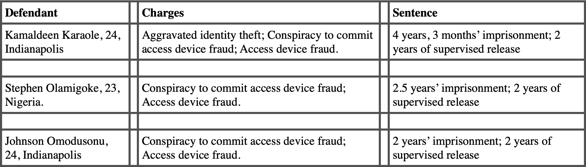 Each defendant was also ordered to pay $520,910 in restitution. At the time Stephen Olamigoke entered his guilty plea, he acknowledged that upon completion of his sentence, he will be subject to removal from the United States.