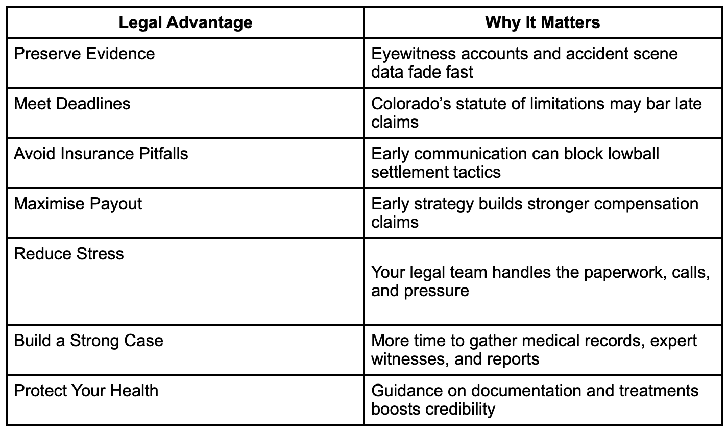 If you’ve been injured in an accident, speaking with a Denver personal injury lawyer as soon as possible gives you the upper hand. It helps preserve your rights, increase your chances of getting the compensation you deserve, and reduces the stress of handling everything alone.