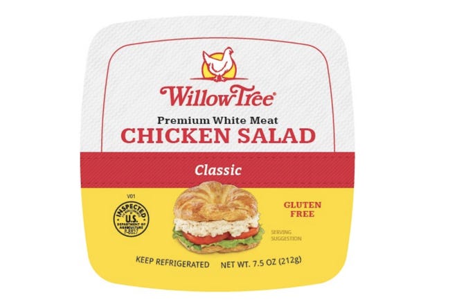 - 7.5-oz container of “Willow Tree Premium White Meat Classic Chicken Salad” with sell by dates of 09/07/2021 and 09/09/2021.